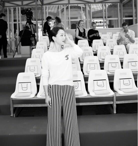 周迅一身经典的Chanel条纹阔腿出席高定时装周