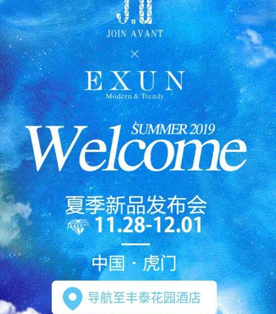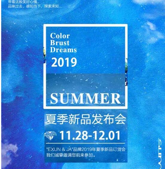 11月28日至12月1日,JA品牌女装2019夏季新品发布会暨订货会即将在广东省东莞虎门丰泰花园酒店隆重举行,我们诚邀各界大咖前来考察洽谈!一起领略JA的时尚魅力,抓住2019的成功商机。