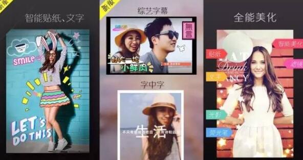 玩图除了具备强大的做图美图功能外,还同时具备强大的文字功能,综艺字幕和字中字是很不错的功能,也是其他做图软件少有的功能。非常适合设计海报,封面等。贴纸功能里面丰富贴纸也会给你的作品锦上添花。