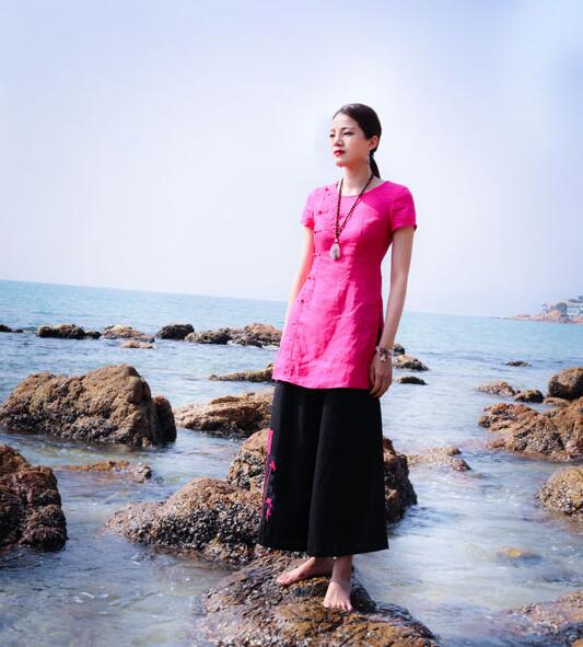 一款旗袍型的粉色上衣配上轻简的黑色系半裙,不在只是单纯的少女,而是注入一丝高雅颜色,让全体变得更有韵味。同时采用舒适棉麻的它,也让穿戴更加舒适。