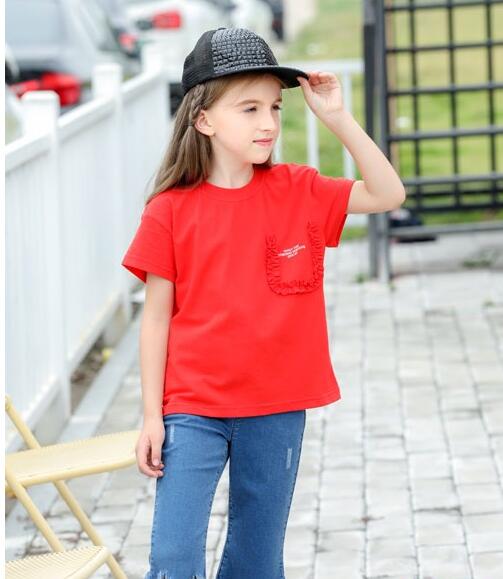 纯净明亮的赤色圆领短袖T恤,简约的品牌标识表现品质感,搭配一条淡蓝色的时髦牛仔裤,流苏的裤脚潮流唯美,时髦却不夸张。