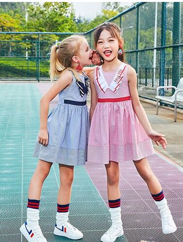 简约时尚魅力的连衣裙,精致的做工和独特的款式设计,纯净的淡蓝色和粉色,窄肩精美款式,点缀深蓝色和白色领口,赋予童装的有趣性,束腰抽褶阔版裙摆,蓝红线条的高装袜和运动休闲鞋,充满阳光魅力。
