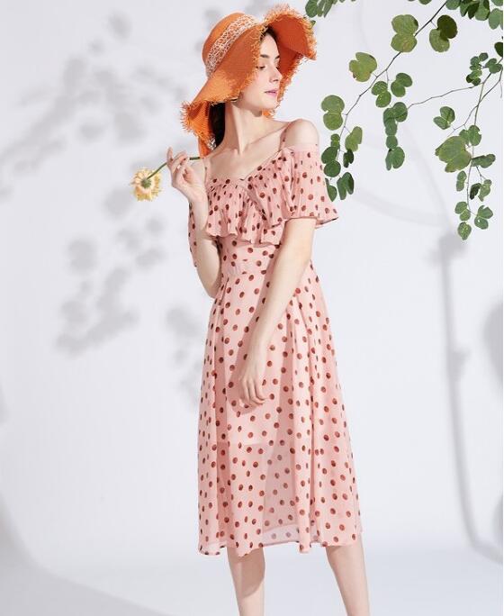 一袭粉色连衣裙更为清爽大方,小露肩的款式也极为个性吸晴,使得整体增添了几分趣味与俏皮感。木耳边衣袖设计也极为个性,巧妙将胸部与胳膊遮挡。简洁修身的版型也很好的将曼妙身姿勾勒出。直筒的版型也极为休闲活力,加上轻薄雪纺衫的面料,也极为舒适透气,对于夏季而言可是非常不错的选择。整体既简洁清爽,又不失时尚甜美。