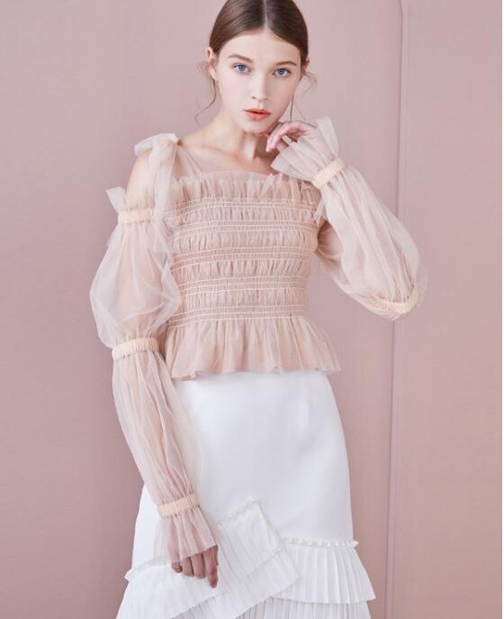女生可盐可甜,才会惹人爱,粉色纱质的面料款式,收腰的设计,短款的版型,方领的呈现完美的锁骨凸显,清新感尽显,下身一条白色包臀裙即可,个性不规则的百褶裙摆修饰,也是不错的选择。