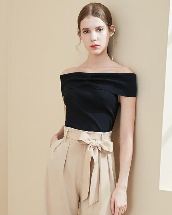 耐看的女生也可以选择黑色,其实黑色是非常好看的颜色,露肩黑色T恤衫款式,可以呈现性感,也非常显瘦,下身一条卡其色高腰直筒裤即可,卡其色的装扮简约又大方,这样的造型可以是帅气也可以是性感女人味。