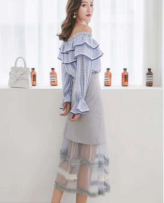 LOOK1:今夏一字肩单品掀起了穿搭热潮,女生可以为自己选择一件灰蓝色的一字肩上衣,颜色清新低调,一字肩单品的运用提升了造型的女人味,版型淑女显气质。下身搭配一条灰色的拼接款式的半身纱裙,颜色经典低调,拼接款式亮眼大气。再搭配一双白色波点包头拖鞋,打造出了淑女有气质的逛街穿搭!