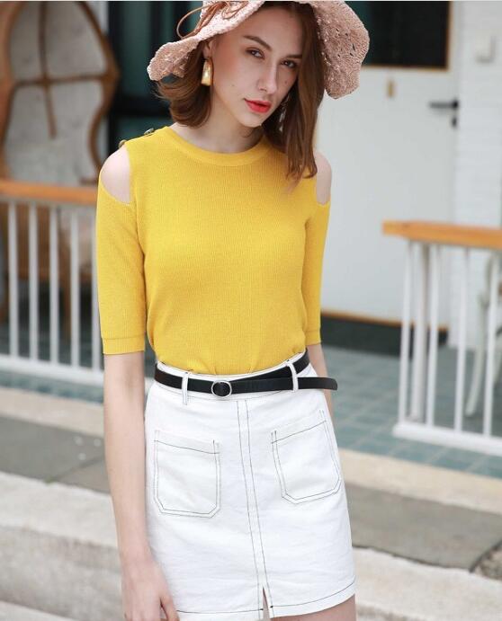 为了符合夏日的氛围,女生可以为自己选择一款亮色系的短袖,歌宝琪女装品牌这款黄色露肩短袖,颜色亮眼衬肤色,露肩设计穿起来更具时尚感。下身搭配一条白色的短裙,简约清爽,显高有气质。再佩戴一款粉色遮阳帽,提升了造型的时尚感!打造出了靓丽的显高造型!