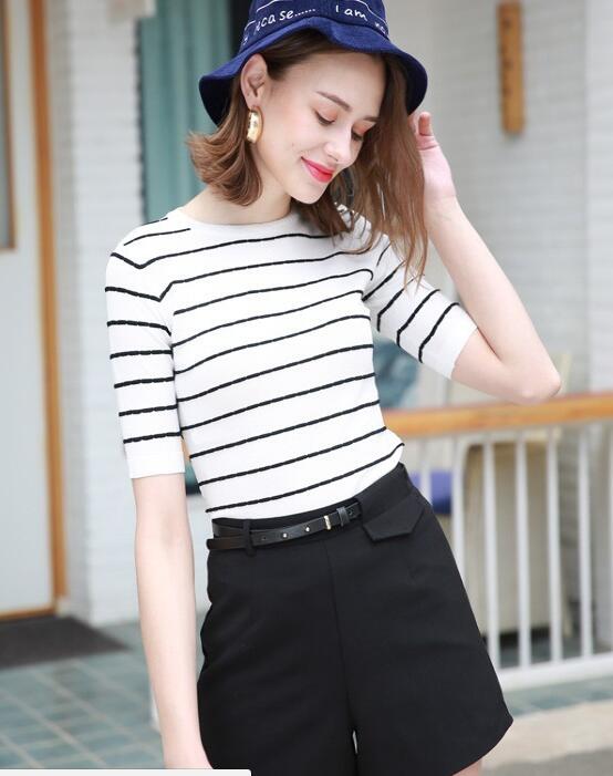 条纹元素时尚经典,女生可以为自己选择一件条纹短袖,配色经典耐看,条纹元素时尚经典,穿起来大方得体,修身效果凸显身型。下身搭配一条黑色短裤,颜色经典百搭,穿起来拉长女生身型,达到显高的效果,休闲耐看!再佩戴一顶深蓝色的渔夫帽,造型时尚感UP!