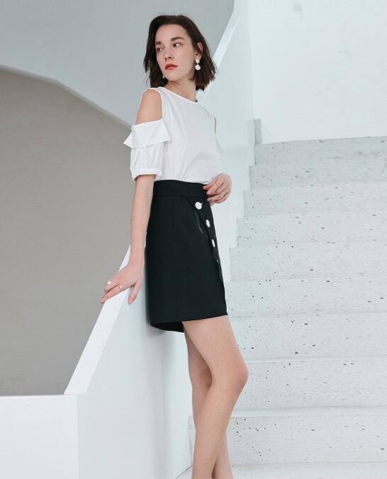 LOOK1:女生可以为自己选择一款简约风的包臀短裙,艾诺丝雅诗女装品牌的这款包臀短裙就不错,版型简约大方,装饰扣设计避免单调,穿起来拉长女生身型。上身可以选择一件白色露肩短袖,颜色清爽干净,露肩款式更显女人味!再选择一双黑色尖头高跟鞋,打造出了简约显气质的夏日造型!