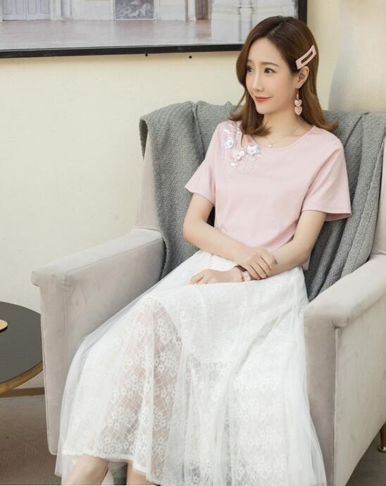 粉色和白色的结合是最干净的搭配之一了,这套搭配看起来非常的清新自然,也是减龄装的必备。简单的粉色的T恤短袖,领口的设计是经典的圆领,显得俏皮可爱,在领口处还加了刺绣的时尚元素,不仅时尚好看还增加了设计感与细节感。下面搭配的是一条白色的纱裙,轻薄的纱层非常的有质感,里面有纯白的内衬,外面是一层刺绣的设计,非常的飘逸,看起来仙女气十足。