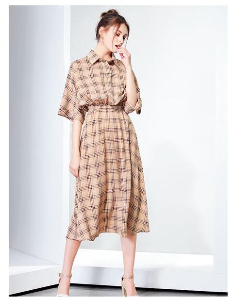 这款深卡其布色长款连衣裙,连衣裙上的图案采用是格子,设计的材质则是涤纶整体的风格则是通勤,宽松大气的袖口则是蝙蝠袖。整体看来是非常的有气质以及优雅,收腰效果也和明显。