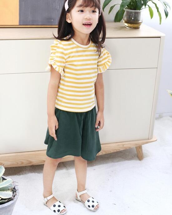 伊琴洛思童装这件黄白条纹的圆领短袖T恤,采用精致的圆领版型设计,加上甜美的木耳边袖子的点缀,让简约的T恤多了几分甜美气息。而且优质的纯棉面料,穿着起来更是舒适透气。搭配上一条墨绿色的高腰伞型半身裙撞色,带来满满日系复古风的味道,特别的时尚耐看。