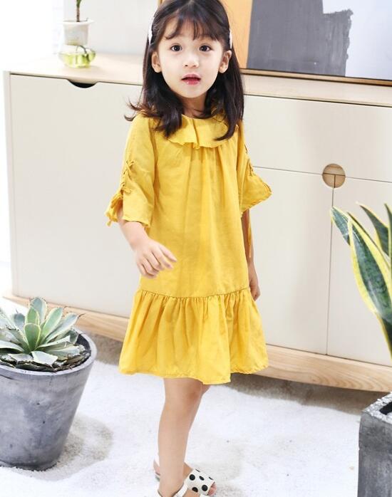 要说夏天穿什么最为方便,那非常连衣裙莫属。上图这件女童黄色系的连衣裙,采用荷叶边的翻领设计,带来满满甜美可爱的气息,而且袖子上交叉绑带感的袖口,丰富了整体的视觉感,配合宽松的裙身以及荷叶边的裙摆,穿着起来包容性极强,也能够轻松的帮你遮住臀部以及大腿上的肉肉,搭配上一双黑白撞色的波点凉鞋,时尚感爆棚。
