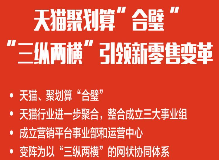 12月2日午间,阿里巴巴集团CEO张勇在一封发给内部职工的揭露信中宣告,天猫团队和聚合算团队将全部一体化,天猫将树立三大工作组、推广途径工作部和运营基地,变阵为以“三纵两横”的网状协同系统加若干独立工作部的全新架构。