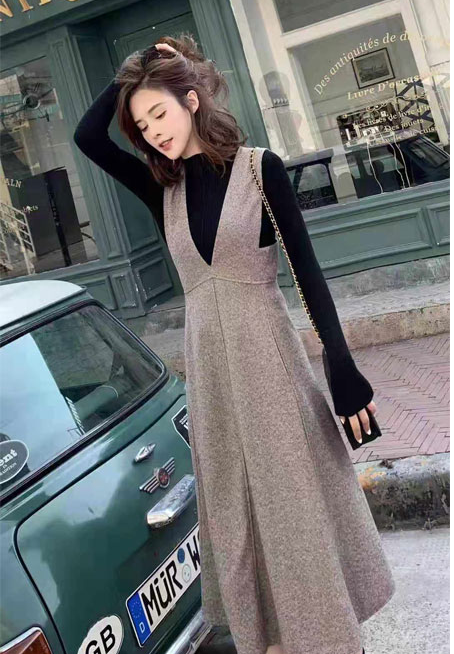 黑色的打底衫搭配灰色毛呢吊带裙,时尚优雅而不显得突兀。而且吊带裙自带俏皮可爱,这样的一款减龄神器,买它一定没错!