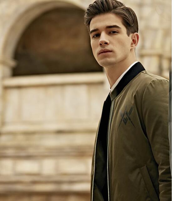 或者一件黄棕色的夹克外套也是不错的选择,成熟稳重的颜色,彰显男性的魄力,也更有安全感。金属拉链简约大气,精致带感。黑色圆领与袖口作为拼色,拒绝过于单调。整体时尚整洁,休闲舒适。