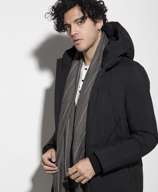 羽绒大衣最容易起范,简捷上身御寒保暖,不需要过多装饰。搭一条灰色的条纹长围巾,长长的尾巾优雅地垂坠,温婉又细腻。黑色的衣身,一样的不声不息的稳重气质,宽阔大气的廓形,休闲率性的连帽,极具衣身优雅的男性气度。