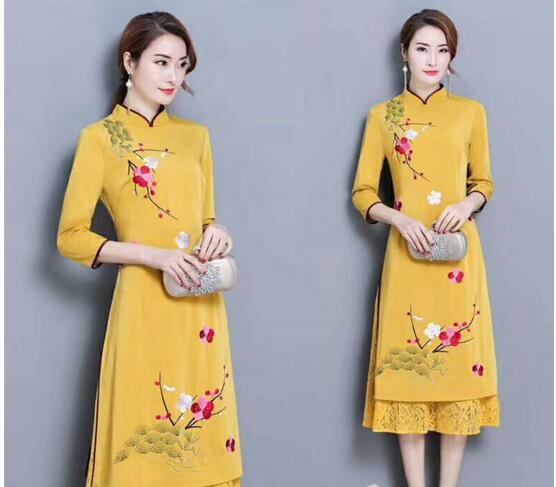 皮肤白皙,喜欢古风,又不喜欢冷色的你,这一款黄色的玛娃2018春夏复古民国风绣花拼接旗袍连衣裙必然是一个很好的选择。裙尾得小蕾丝花边让这一款裙子显得更淑女,又不失风格,喜欢就收下吧!