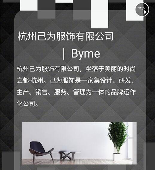 Byme是杭州己为服饰有限公司旗下的品牌,坐落于魅力的时尚之都——杭州。己为服饰是一家集设计、研发、生产、销售、服务、管理为一体的品牌运作化公司。希望打造具有国际风范,又蕴含东方女性典雅之美的时装,她们知性优雅,自信独立、成熟性感,穿搭搭配毫不含糊。