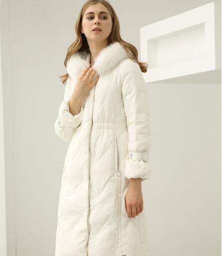 这件羽绒服是纯白色的,有着白色的清新和纯净,很多比较青春,斯文的女生都会喜欢的颜色。羽绒服长及膝盖,中间松紧带束腰,两袖皮带束手,让身材显现的时候还保暖性加强,羽绒服的缝线方式是菱形的,小鸭羽绒的帽子让你的脖子更加美丽。