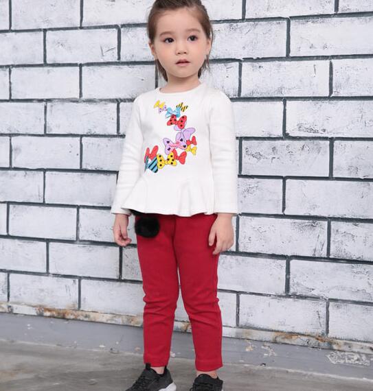 白色上衣,荷叶裙摆,缤纷多彩的卡通印花,清新可爱。搭配红色休闲裤和黑色运动鞋,简简单单,甜美可人,尽显小女孩天生的懵懂可爱。