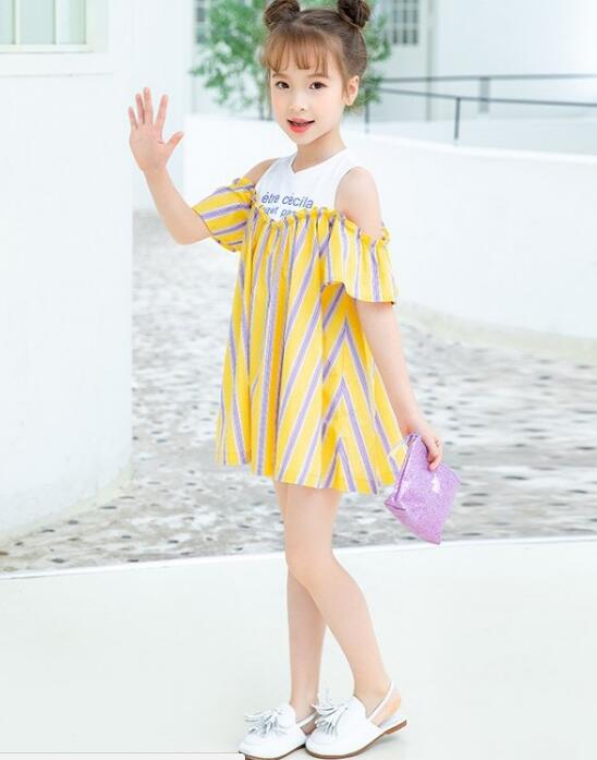 这款条纹连衣裙也是采用黄色,颜色超级显白整体风格比较清新甜美。一字肩的设计调皮又性感,里面的背心设计休闲又舒适,裙子的长度比较短,显得腿会很细,需要搭配一条安全裤。纯棉面料舒适透气,小女孩夏天穿会非常舒适,搭配一双白色的小皮鞋就非常好看,这套搭配出街或者去海边游玩都是非常合适的。