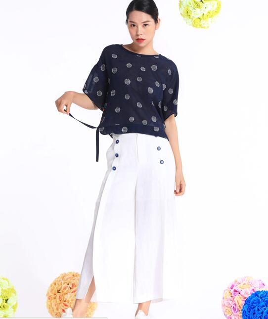 除了连衣裙也有衣装可以展现出个性,比如这款宽松宽松的上衣,衣装上有园点装饰,增加了一丝色彩。在搭配一条纯白色的长裤,更显你的大长腿。