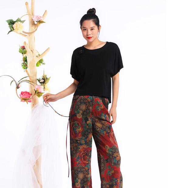 上身是一款黑色的短袖再配一条复古风的长裤,上身的简约调与下身的复古调产生的碰撞,让你整体看起来更加绚丽,这也是非常的时尚。