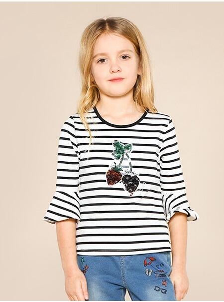 条纹装一直是很多妈妈的选择,面料舒适,颜色款式也非常好搭配,下身穿上一条卡通印花的牛仔裤,胸口的樱桃利用亮片装饰,映照出宝宝甜甜的笑,温柔萌萌的小女孩,怎能不喜欢呢?