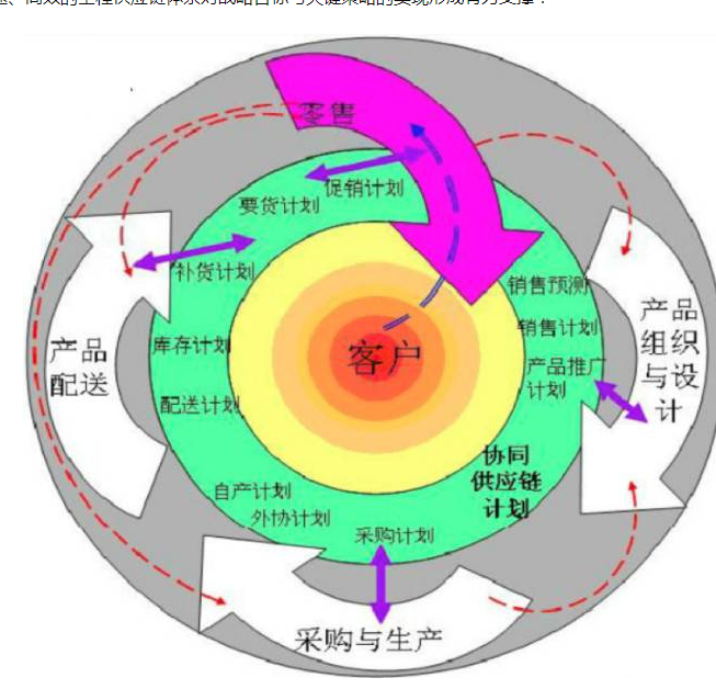 ZARA为了完结“买得起的敏捷时髦”这一战略,以客户为基地搭建起敏捷高效的ZARA的全程供应链体系。可划分为四大期间,即产品安排与规划、收购与出产、产品配送、出售和反应,一切环节都围绕着方针客户作业,全部过程不断翻滚循环和优化。