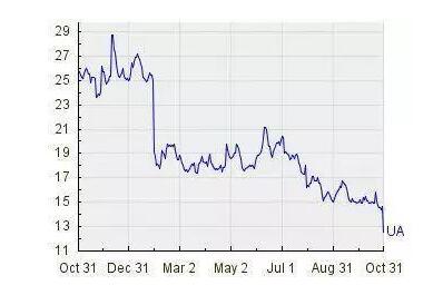 UA在11月1日开市前披露上述财报数据,公司股票应声下挫,其中A类(UAA)股票价格跌幅近24%至12.51美元,C类(UA)股票跌幅近22%至11.53美元。此番下跌后,UA公司的股价自今年起已累计跌幅达57%,仿佛坐上了一条陡峭的滑梯。