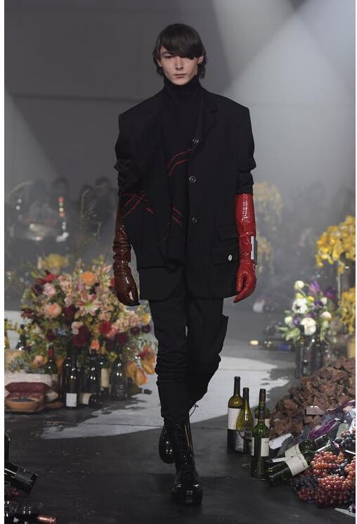 秀场布局并没有“很年轻”。相反看起来像狂欢后清晨的古典大师画:葡萄酒瓶子,半满的玻璃杯,成堆的奶酪和巧克力,四处蔓延的花朵,堆在T型台边上的水果,还有巧妙摆放在中央、用长长的柠檬削皮组成的道具。一种颓废的繁盛。难怪空气里可以嗅得到衰变(柠檬皮的辛香气,和在现场开始腐烂的物件)。Michel Gaubert的秀场配乐里,古典弦乐四重奏过渡到硬核舞曲,Simons的古典大师画作最终被狂野的镭射光洗劫。他一直在把玩着这样的并置。罕有的“历史碰撞未来”的历史主义在他的设计中体现。就像是猎场看护人变成了银翼杀手。本季他标志性的超大尺寸外套(再说一次,外套特别棒)对修长西装的奢华缎面形成了鲜明对比,再搭配基本脱离身体的针织品、类似半身胸甲那样半挂的毛衣。实用注意的橡胶靴和乙烯基歌剧长手套形成的对比恰到好处。