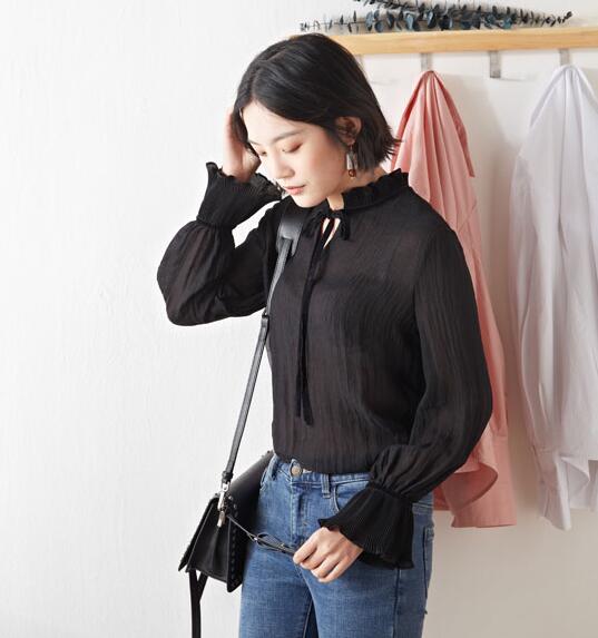 衬衫+牛仔裤的穿搭,有型又起范清爽简约风。这款棉麻质感的纯黑色衬衣,格调别致的喇叭袖与雅致的竖领时髦带感,衣身带着稍微的透明感展露女性性感魅力。穿一条深蓝牛仔裤,色调统一,个性又率性。
