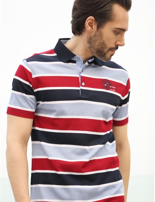 有时候极简也不是一件单调的事情,男装的设计上要简单又要风格多样,设计上的难度很大,这里选择的就是这样一件非常简单的黑红灰三色条纹短袖衫,添加了一点点翻领装饰,使得整款服装都变得高级起来,还是比较紧身的款式,能够非常好的展示出男士们的帅气身姿,不管是搭配上牛仔裤装还是黑色修身裤都能穿出这款T恤的帅气感。