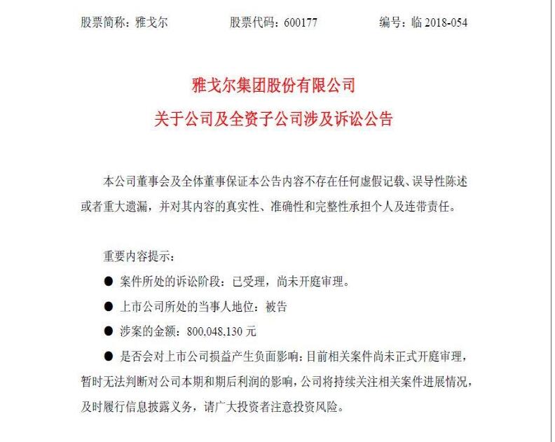 对此,雅戈尔方面表明,现在相关案子没有正式开庭审理,暂时无法判别对公司本期和期后赢利的影响,公司将继续关注相关案子开展状况,及时履行信息发表责任,请广大出资者留意出资风险。
