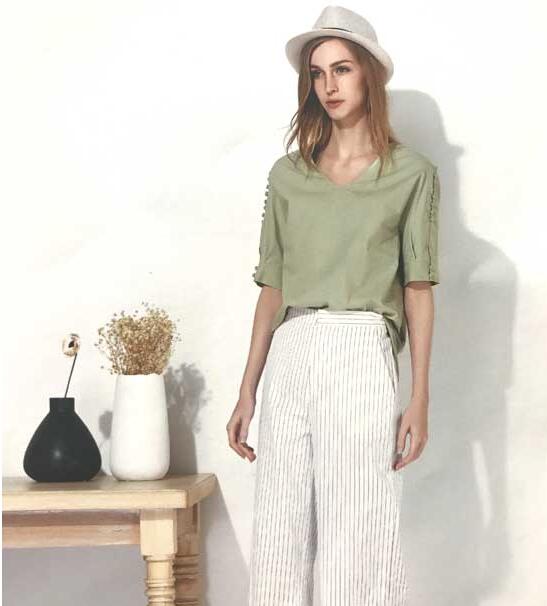 夏日里的裤子,尽量选择轻柔的面料和凉爽的色系吧。这样会让你的温度迅速下降而你的风度迅速上升。橄榄绿的V领上衣很简洁,没有半点花纹,下身配上高腰的竖纹白色阔腿裤,让你的衣服品位和好感度上升,整体充满快时尚的感觉,是大家现在普遍会接受的穿衣搭配方式。