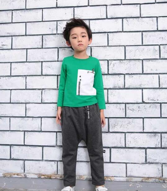 这样寒冷的秋冬季节,还要穿黑白灰吗?这样也显得太没有活力了,鲜活的颜色更能显示你I个性魅力,能够招来好运哦~小朋友喜欢,叔叔阿姨也是很喜欢的。这次我给男宝选择了鲜绿色的tee上衣,上面有着白色的色块,下身是灰色的棉质长裤