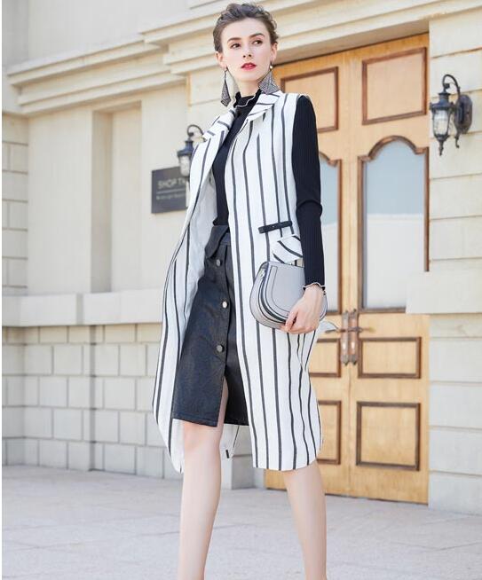 条纹的花样很多,有竖着的条纹也有横着的条纹,只要设计得当,条纹既能显瘦又能凸显不凡气质。像这件白色底加上黑色竖条纹,干练清爽的风格立即呈现,里面搭配黑色简约毛衣,还有开叉半身裙,都市职场气息十足,干练的气质能够让你在职场加分。