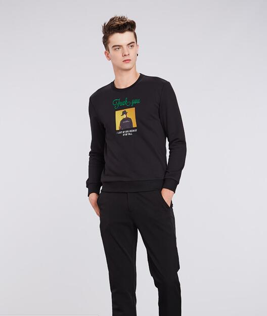 这一件黑色长袖稍贴身的版型不经意间就展现了男生挺括的身材,而且黑色的一身高冷又帅气,前面的图案也让整体增添了几分时尚感。