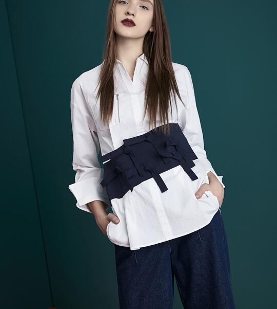 而且这一件白色衬衫也并不像其他衬衫是单调乏味的白,腰间的深蓝色独特装饰让它展现出不一样的格调。