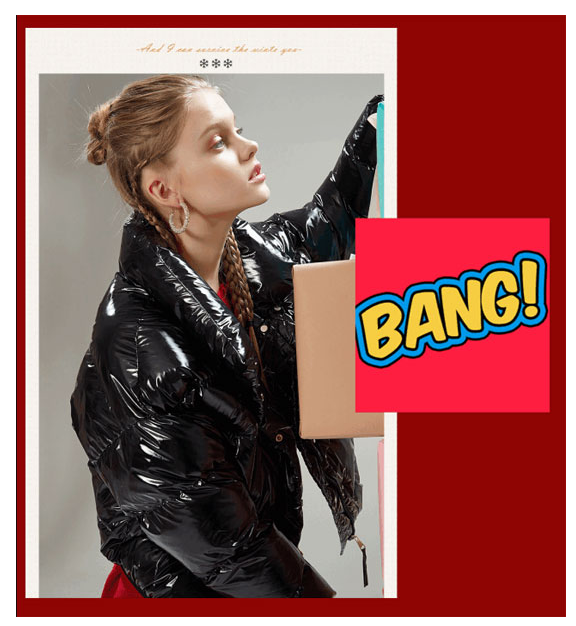 红色短款棉服,下摆独特的抽绳设计,轻松打造出半弧形廓形,时尚街头范展现你的年轻主张!搭配黑色打底毛衣、小短靴,跨年锦鲤好运来~