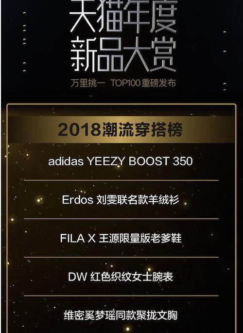 其中,在2018年度天猫首发潮流穿搭新品榜上有不少运动品牌的身影。adidas YEEZY BOOST 350、FILA X 王源限量版老爹鞋、李宁巴黎时装周系列休闲鞋和AIR JORDAN 33一起上榜,成为天猫2018 TOP100新品。