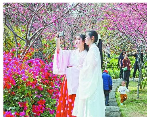 安福家园记者得悉,昨日,阳光明媚的午后,大屏山的樱花谷姹紫嫣红。有爱好汉服的姑娘约上好友结伴踏青赏花,看那山樱花粉红色的花蕾在羞答答地簇拥枝头,美不胜收。远远看去,身着汉服的姑娘漫步于花丛,微风缓缓,裙裾轻扬,亦是别人眼中一道亮丽的风景。