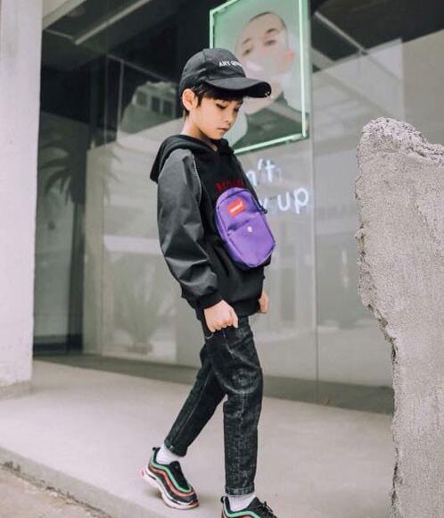 科技化纤防水面料的连帽卫衣,亮黑色时尚感超强,简约的字谜印花,衬出童趣感,搭配一条灰色质感的牛仔休闲裤,在春日的阳光里走走,非常时尚惬意。