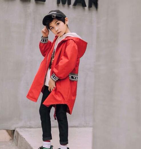 桔红色扩版连帽风衣,是对传统款式风衣的改造升级,简约时尚的黑白罗纹袖口点缀,搭配一条黑色紧身牛仔裤,小男生酷得不要不要的。