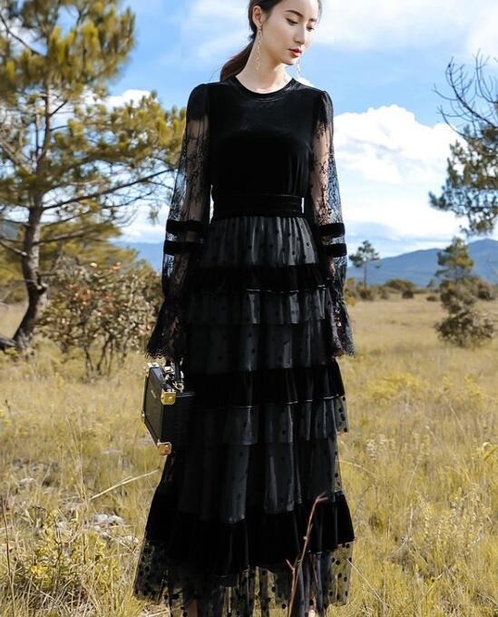 如果说上一款是公主装,那这一款就是女王装,黑色典雅的颜色,在夏季穿非常显白哦。袖口处采用了蕾丝印花设计,舒适透气。下身采用层次叠加款,具有鲜明的层次感。可以搭配一双小凉鞋或是拖鞋,简单优雅。
