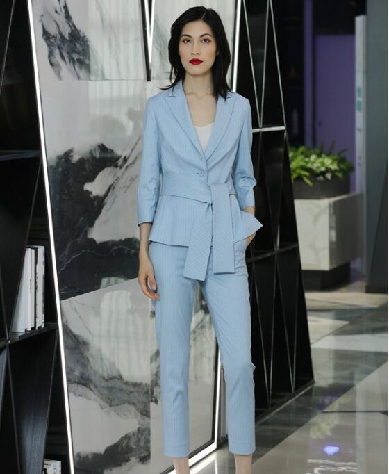 夏季挑选西装套装,蓝色系的非常推荐哦。蓝色是一种很温柔清爽的色彩,在夏天尤其能给人舒服的视觉效果。这款天蓝色系的西装套装,简约经典的条纹款式配上女士西装收腰处理,整体干练简约的同时更突显时尚的女人味,优雅不失自信。