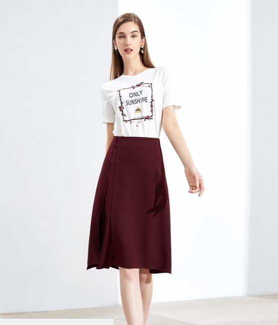 袖搭配半身裙,这样的穿搭很平常,但是选对颜色就很吸睛。很简单的一款短袖,字母印花设计,使这款短袖不那么的单调显得乏味。下身搭配一件酒红色的半身裙,高腰的版型,A字型的裙身,完美的展现身材曲线,同时搭配一双高跟鞋,优雅又大方,穿在身上时髦又休闲。