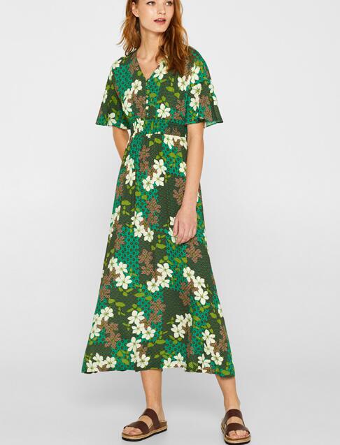 衣领设计:V领设计,优雅时尚,袖型设计:时尚个性合体常规袖型,腰部特色:后腰松紧束腰设计,打造纤细腰身,图案设计:花卉印花设计,增添美感,优质面料:精致面料,尽显质感。