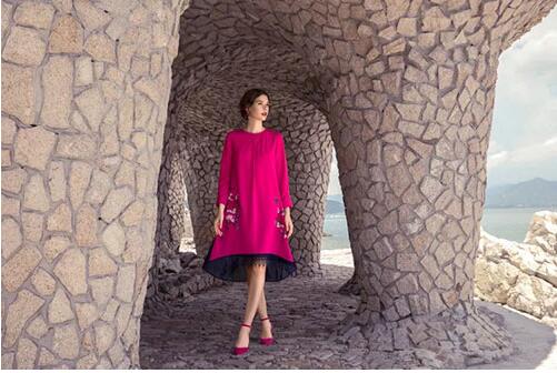玫红色连衣裙面料采用韩国进口化纤混纺料,面料舒适,垂感极好,模拟天然纤维,亲肤性极强。宽松的版型结合垂感极强的面料,胸前一个倒褶使得整体裙装显瘦,后面大胆的撞色设计是整个衣服的亮点,穿上身使得女性身材高挑,浪漫舒适又无拘无束,胯两侧的绣花设计是整体的点睛之笔,时尚的十字绣绣花,精致又高级,结合下摆流动的撞色流苏,彰显舞动之灵。